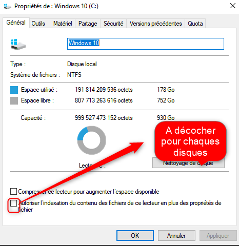On va commencer par les disques ,donc on ouvre l'explorateur windows ou sont situées vos disques c: etc... et on clique droit sur chaque disques et on clique sur propriété du disque et on décoche "autoriser l'indexation du contenu.... ensuite ok et on choisit la deuxième qui est coché appliquer au lecteur et au sous dossiers et aux fichiers